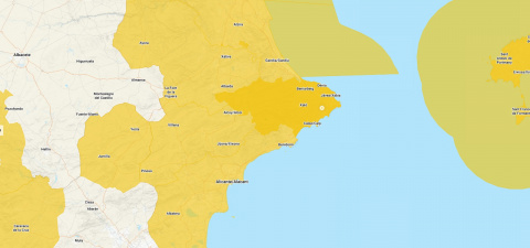 Además, Aemet ha activado el aviso amarillo en el interior de la provincia de Alicante, por acumulados de 20 l/m² en una hora y 60 en doce horas, también con riesgo de granizo y viento fuerte.