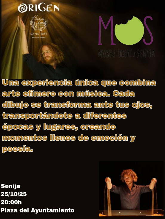 El próximo sábado 25 de octubre, a las 20:00 horas, Senija vivirá una experiencia artística única con la representación de ‘Origen’, un espectáculo visual y sonoro de Borja Sand Art, programado dentro del proyecto MOS (Museu Obert a Senija).
