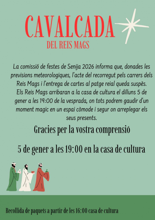 La Comisión de Fiestas de Senija 2026 ha comunicado cambios en la celebración de la llegada de los Reyes Magos de Oriente ante las previsiones meteorológicas adversas previstas para la jornada del lunes 5 de enero. Por este motivo, queda suspendido el recorrido de Sus Majestades por las calles del municipio, así como el acto de entrega de cartas al Paje Real.