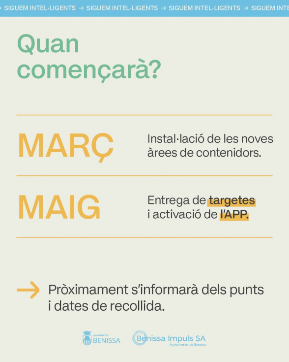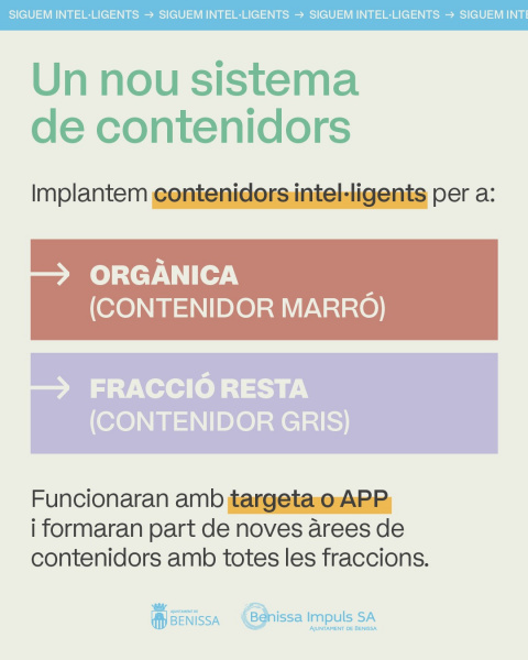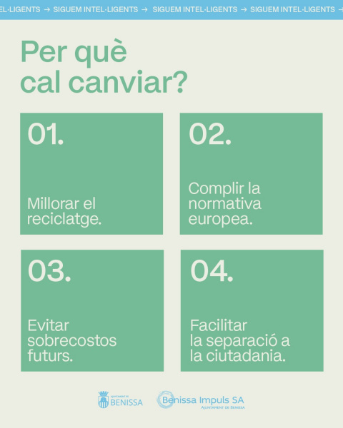 El Ayuntamiento y Benissa Impuls prevén reforzar en las próximas semanas la campaña de información y sensibilización ciudadana, con mensajes divulgativos dirigidos a mejorar la comprensión del nuevo sistema y fomentar hábitos de reciclaje más eficaces.