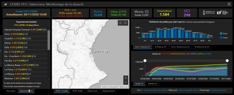A día de hoy, hay algún caso positivo en 83 residencias de mayores (4 en la provincia de Castellón, 22 en la provincia de Alicante y 57 en la provincia de Valencia), 13 centros de diversidad funcional (1 en la provincia de Castellón, 4 en la provincia de Alicante y 8 en la provincia de Valencia) y 4 centros de menores en la provincia de Valencia.